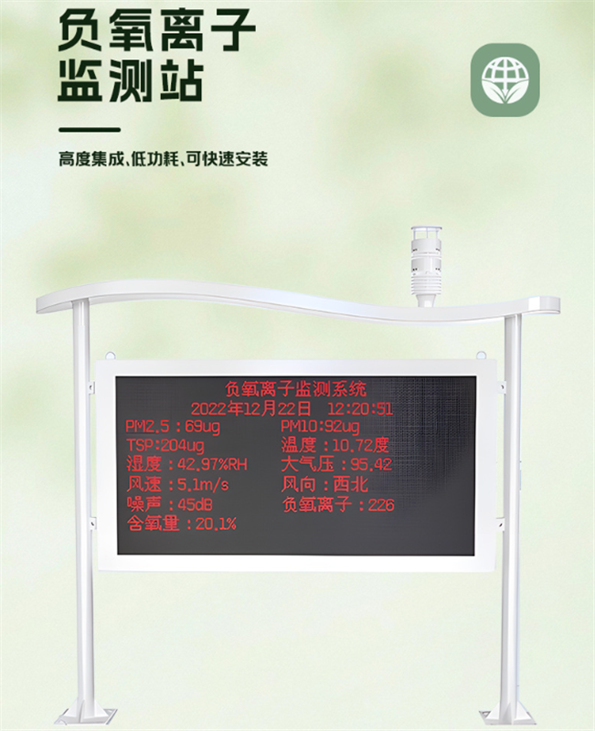 多参数集成,信息全面:除核心的负氧离子浓度外,同步监测PM2.5(反映空气洁净度)、空气湿度(影响体感舒适度)、风速(影响负氧离子扩散),游客能直观感知公园环境质量。